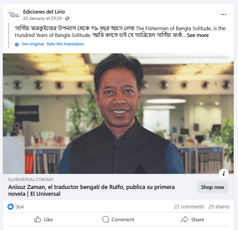 Su pasión por México y América Latina lo llevó a traducir al bangla, su lengua natal, también la obra de García Márquez y Vargas Llosa.